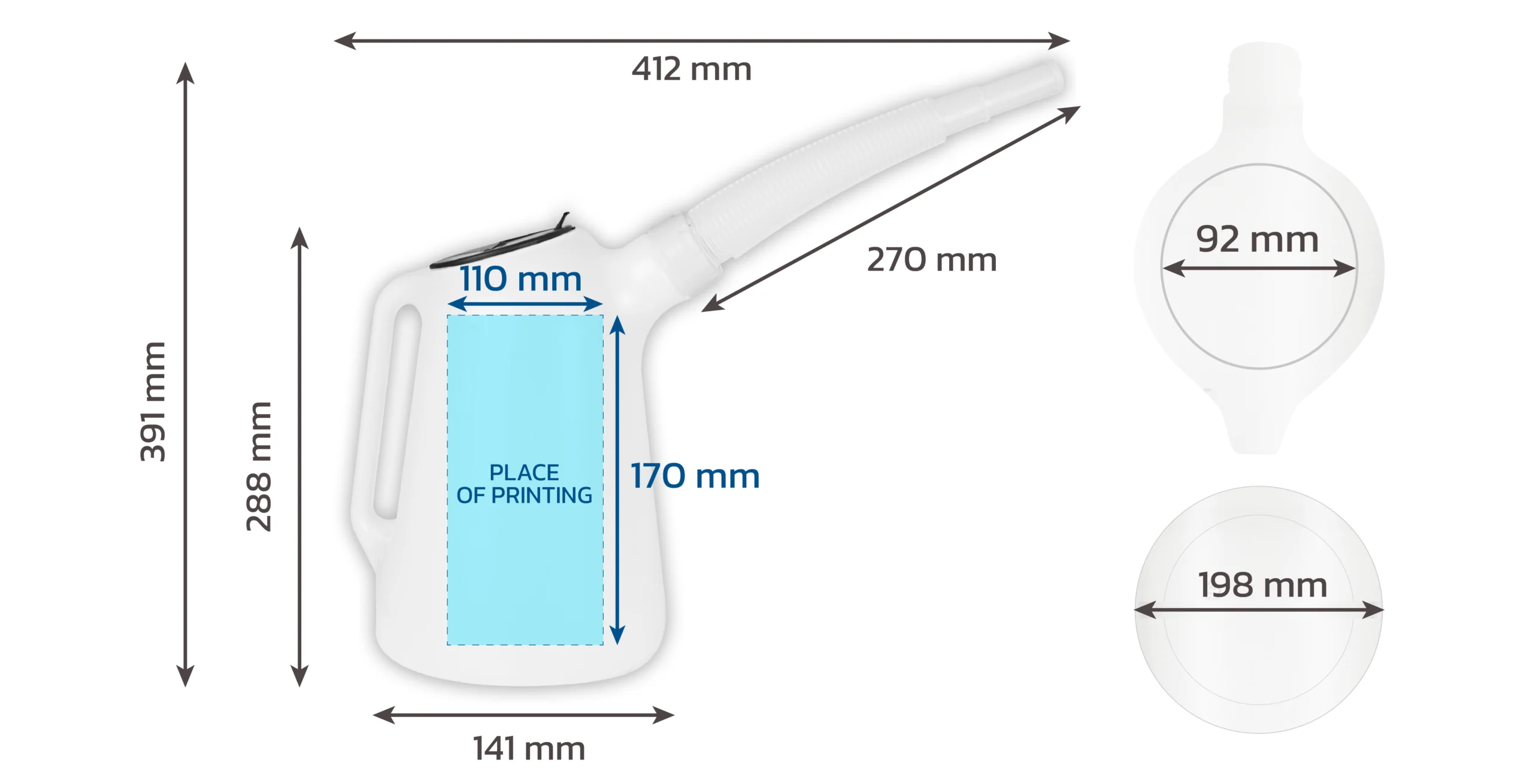 Es kann ein Logo aufgedruckt werden, was die Hauptwerbefunktion darstellt. Die Gießkanne ist geeignet für Öle, Benzin, Kerosin, nicht gefrierende Komponenten, Bremsvorrichtungen und Elektrolyte.