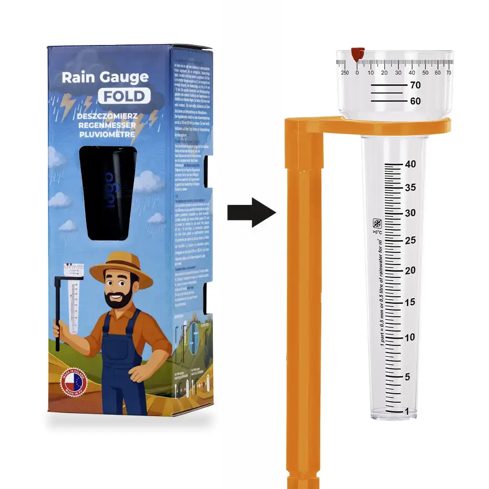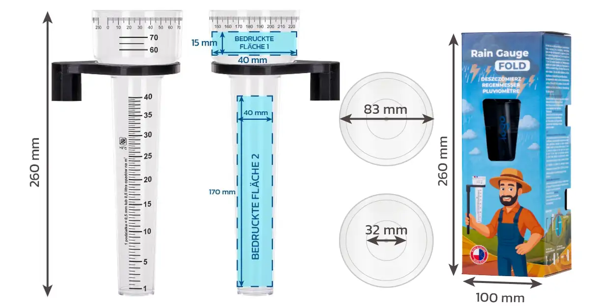 Auf dem FOLD STANDARD Regenmesser besteht die Möglichkeit eines dauerhaften Werbedrucks im Siebdruckverfahren. Dadurch wird das Produkt nicht nur zu einem präzisen Messinstrument, sondern auch zu einem effektiven Werbeträger, ideal für Unternehmen aus der Agrar-, Garten- oder Umweltbranche.